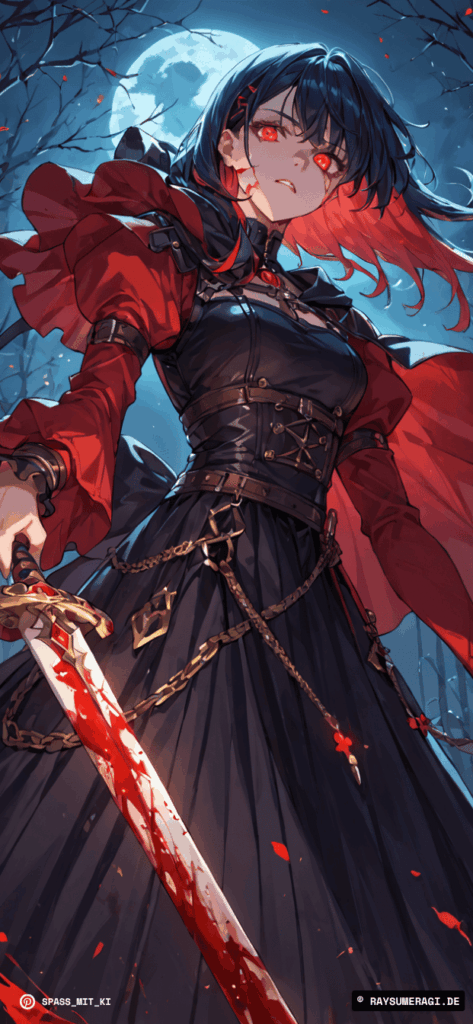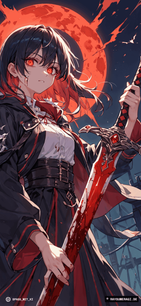 Diese KI-generierte Anime-Kriegerin vor dem Blutmond zieht jede Aufmerksamkeit auf sich.