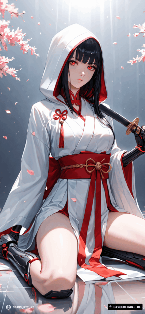 Zwischen Kirschblüten und kaltem Stahl wartet sie – eine Cyber-Samurai in weiß-roter Eleganz.