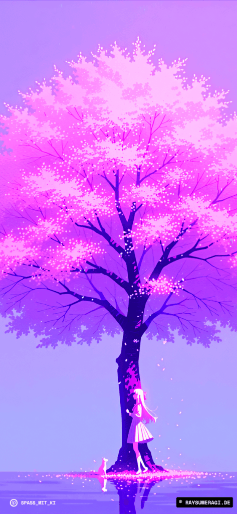 Dieses KI-Bild fängt einen Moment der Ruhe ein – ein stiller Kirschbaum, ein Mädchen mit Gedanken, ein treuer Begleiter.