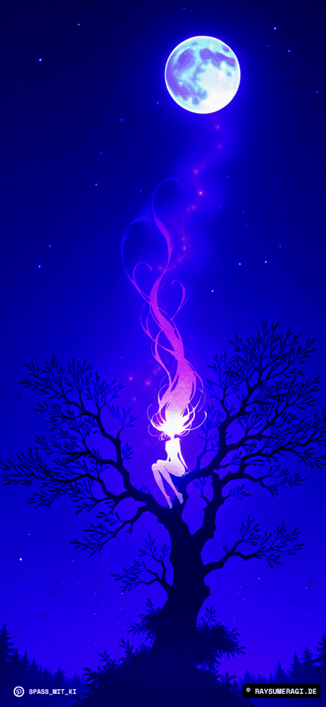 Zwischen Zweigen, Licht und Leere: Dieses KI-Bild erzählt von einer Figur, die träumt – für sich, für niemand, für alles.