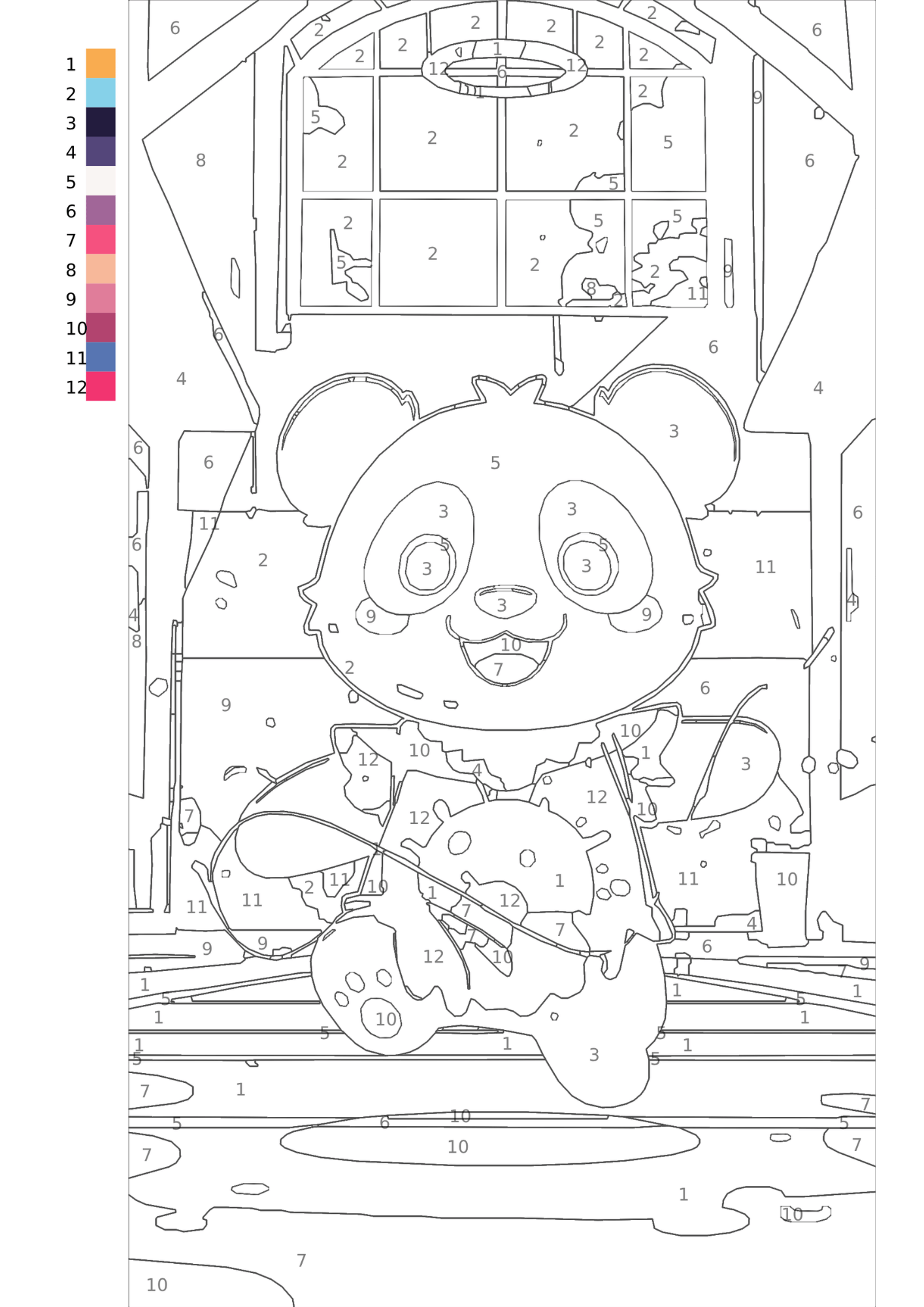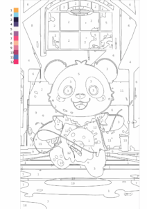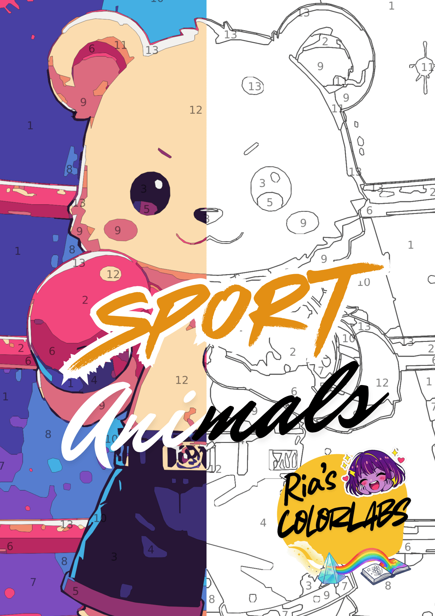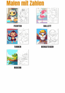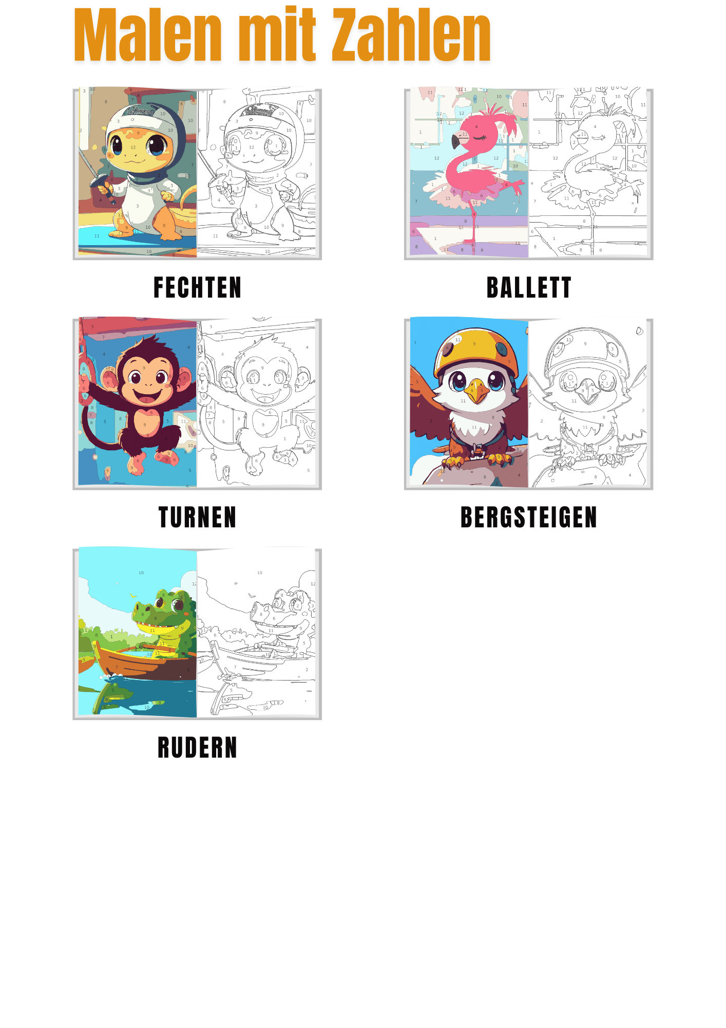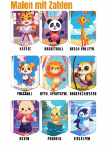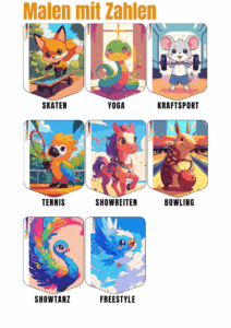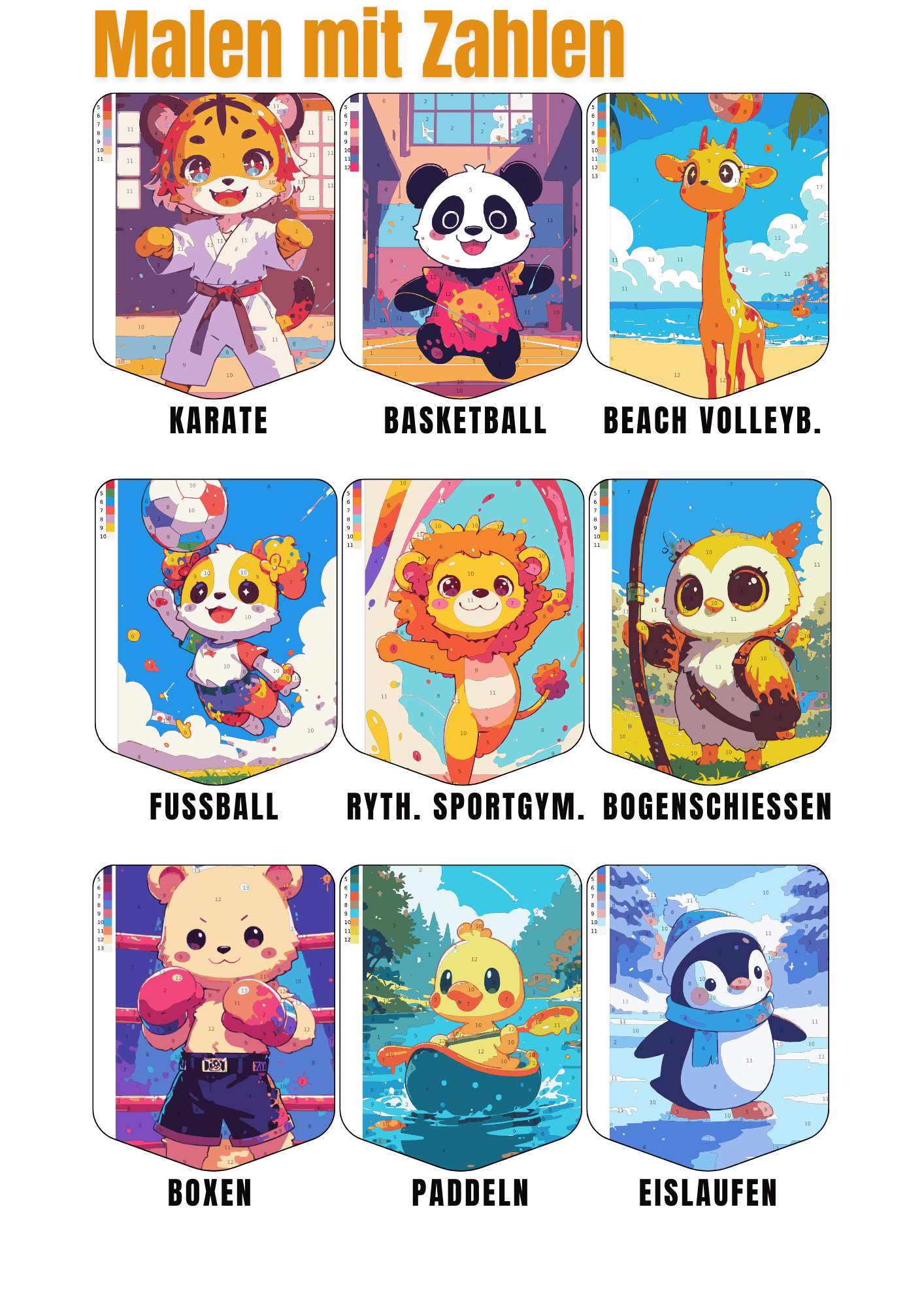 Dieses Set enthält 22 Malen-mit-Zahlen-Motive rund um sportliche Tiere: vom Karate-Tiger über Skateboard-Fuchs bis zum Yoga-Schlange.
