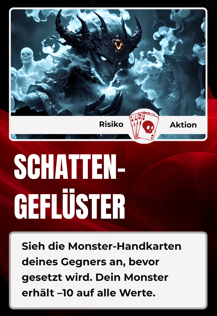 - Um das Risiko auszugleichen, darf der Spieler nach der Runde 2 Monsterkarten nachziehen (statt nur 1).