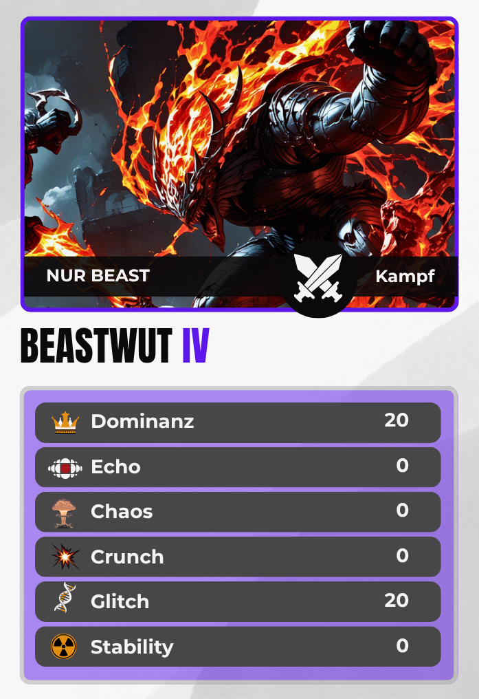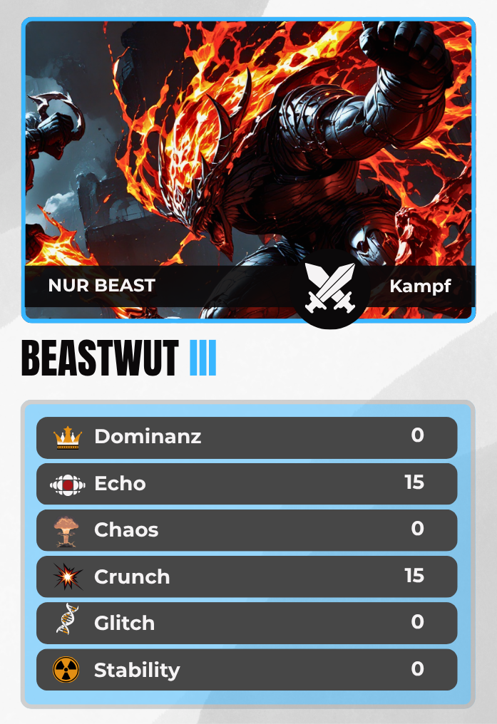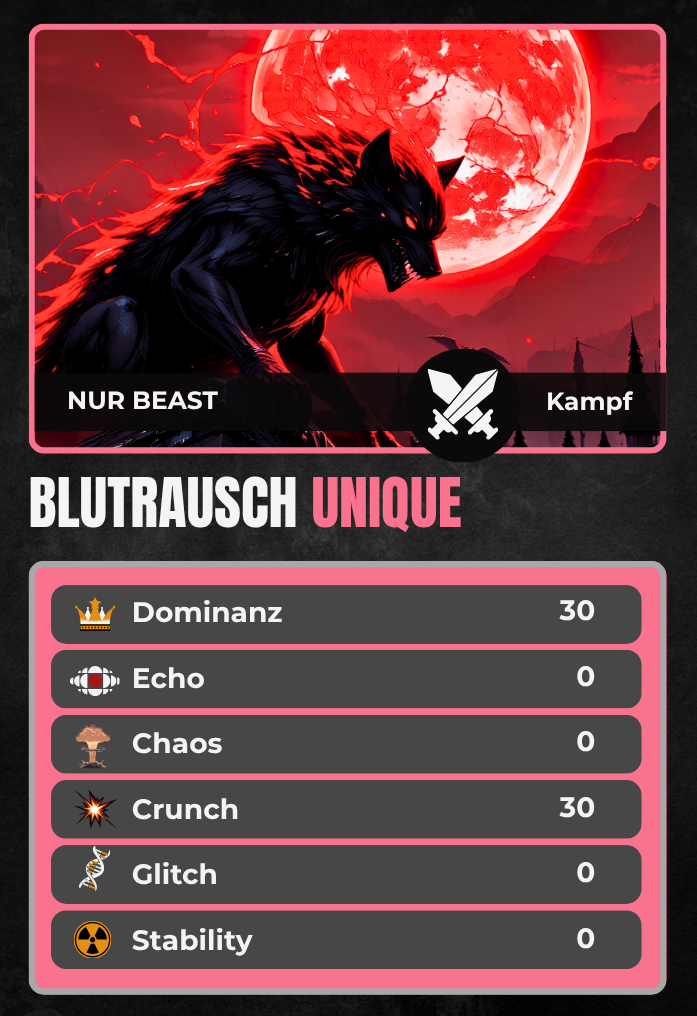- Attribute: Dominanz, Echo, Chaos, Crunch, Glitch, Stability